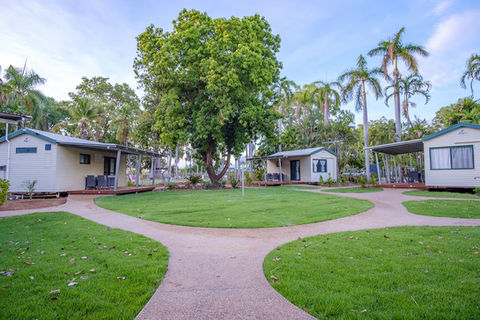Being poolside puts guests close to Kimberleyland’s onsite café — known locally for its specialty coffee — and still within easy reach of other park facilities such as the shared laundry. The park itself fronts Lily Creek Lagoon on Lake Kununurra, so even those staying in the poolside cabins can wander down to the waterfront to watch the sunrise or sunset over the Ord River system. A free airport transfer is available on request, and the cabins are a short walk (about 300 m) from the Kimberley Grande Sports Bar and Restaurant and roughly 15 minutes on foot from Kununurra town centre. With tropical landscaping, thoughtful amenities and an unbeatable central location, the Poolside Ensuite Cabins offer an easy, comfortable base for exploring the East Kimberley.